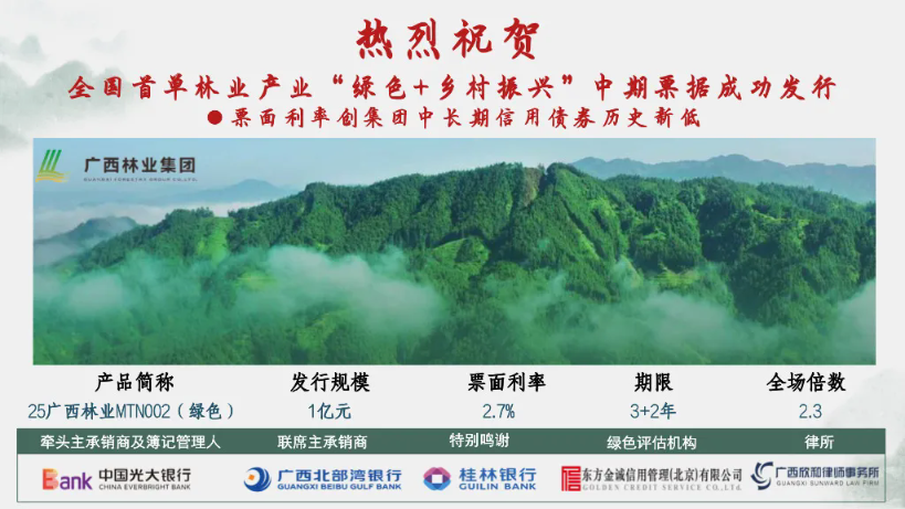 2025年8月4日,廣林集團成功發(fā)行全國首單林業(yè)產(chǎn)業(yè)“綠色+鄉(xiāng)村振興”中期票據(jù),債券發(fā)行規(guī)模1億元,期限3+2年,票面利率2.7%,創(chuàng)公司中長期債券發(fā)行利率歷史新低,為廣西林業(yè)綠色高質量發(fā)展提供資金支撐開辟新渠道,添加新動能。